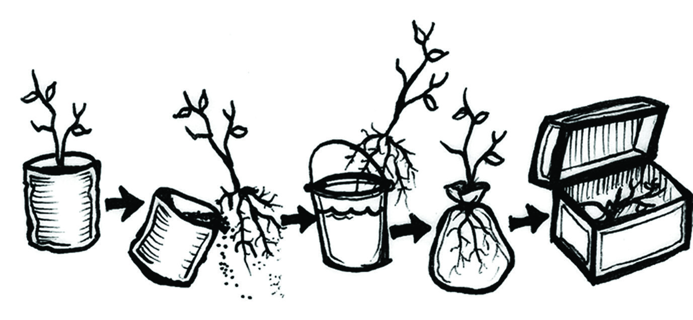 - Procure supplies. Supplies to be secured ahead of time include plastic bags of different sizes, twist ties or string, pruners, buckets, and a plastic trunk to pack down the trees. All the trees should be put in one location where there is access to water (e.g., a garden hose, well, or stream) and a place to leave the left-over soil.