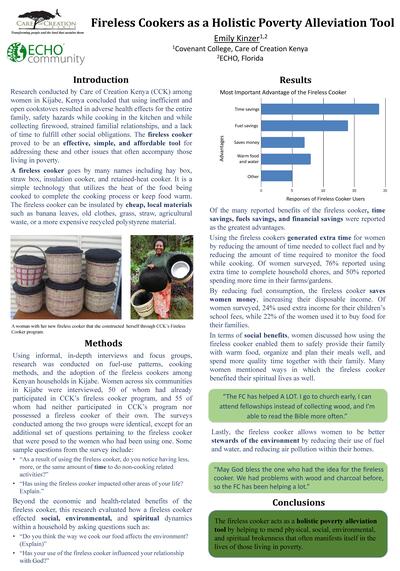 Research conducted by Care of Creation Kenya (CCK) among women in Kijabe, Kenya concluded that using inefficient and open cookstoves resulted in adverse health effects for the entire family, safety hazards while cooking in the kitchen and while collecting firewood, strained familial relationships, and a lack of time to fulfill other social obligations. The fireless cooker proved to be an effective, simple, and affordable tool for addressing these and other issues that often accompany those living in poverty.