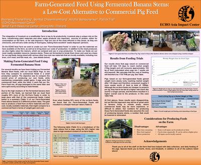 On the ECHO Asia Farm we seek to create our own ‘Farm-Generated Feeds’ in order to use the materials we have available on the farm, as well as to bring down our costs of production. In addition to the meat produced, we also highly value the manure, which we compost and use in crop production. To make our feeds we our most readily available resource, banana stems. These are fermented to break them down and used as a base for our pig feeds, being mixed with various other low-cost raw materials that are locally available, including rice bran, corn meal, and fish meal, etc…