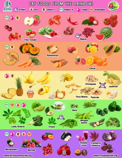The Foods from the Rainbow poster promotes eating foods from ALL color groups. It shows through symbols, the micronutrients that each color contributes such as Protein, Iron, Vitamin C, Vitamin A, Folate, and Antioxidants. This educational tool has been used by health promoters to teach about food diversity. You can print the poster for workshops, mothers have placed it in their kitchens, and it can be printed larger for clinics. For more educational materials visit: www.proyectocan.org